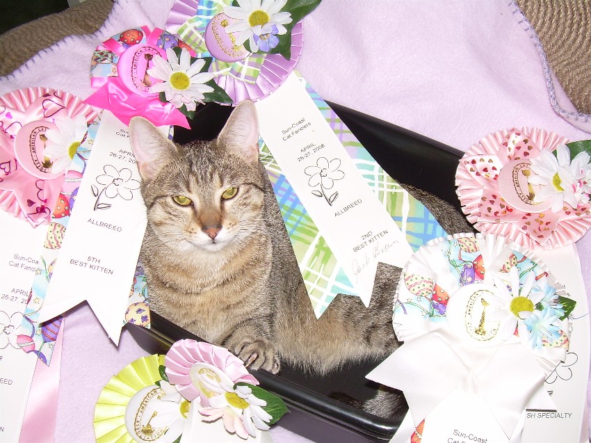 "Imp", (Champion Dragonway Akasha), is owned and shown by Kathy Cordes, (KCCatz).